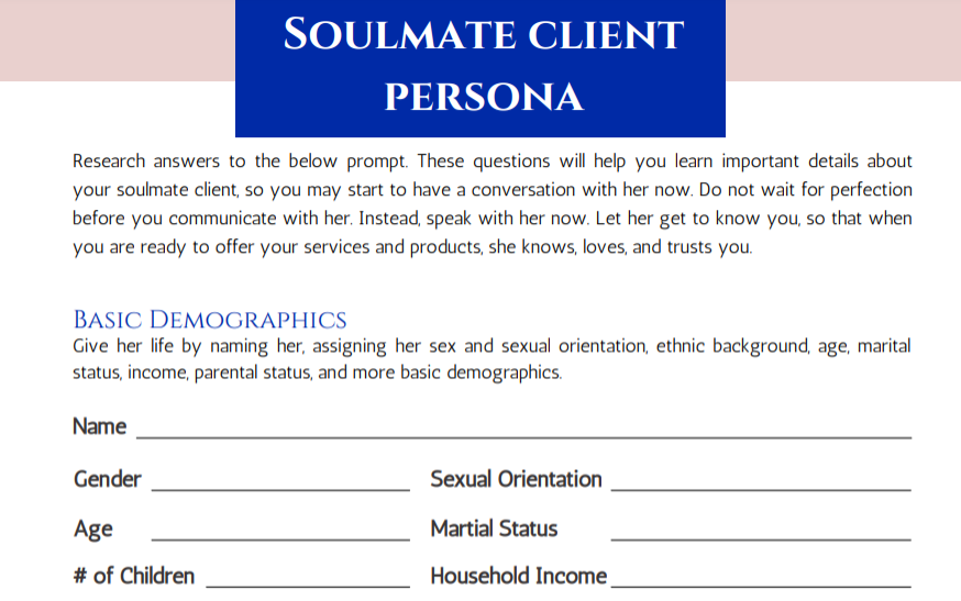 Knowing and understanding your soulmate client is pivotal to making consistent 4-5 figures per client and a significant impact within your tribe. Download the free Soulmate Client Worksheet with free training to better understand your soulmate client.